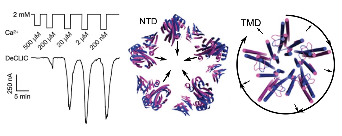 Pentameric ligand-gated ion channels (pLGICs) are allosteric receptors that mediate rapid electrochemical signal transduction in the animal nervous system through the opening of an ion pore upon binding of neurotransmitters. Orthologs have been found and characterized in prokaryotes and they display highly similar structure–function relationships to eukaryotic pLGICs; however, they often encode greater architectural diversity involving additional amino-terminal domains (NTDs). Here we report structural, functional, and normal-mode analysis of two conformational states of a multidomain pLGIC, called DeCLIC, from a Desulfofustis deltaproteobacterium, including a periplasmic NTD fused to the conventional ligand-binding domain (LBD). X-ray structure determination revealed an NTD consisting of two jelly-roll domains interacting across each subunit interface. Binding of Ca2+ at the LBD subunit interface was associated with a closed transmembrane pore, with resolved monovalent cations intracellular to the hydrophobic gate. Accordingly, DeCLIC-injected oocytes conducted currents only upon depletion of extracellular Ca2+; these were insensitive to quaternary ammonium block. Furthermore, DeCLIC crystallized in the absence of Ca2+ with a wide-open pore and remodeled periplasmic domains, including increased contacts between the NTD and classic LBD agonist-binding sites. Functional, structural, and dynamical properties of DeCLIC paralleled those of sTeLIC, a pLGIC from another symbiotic prokaryote. Based on these DeCLIC structures, we would reclassify the previous structure of bacterial ELIC (the first high-resolution structure of a pLGIC) as a “locally closed” conformation. Taken together, structures of DeCLIC in multiple conformations illustrate dramatic conformational state transitions and diverse regulatory mechanisms available to ion channels in pLGICs, particularly involving Ca2+ modulation and periplasmic NTDs.