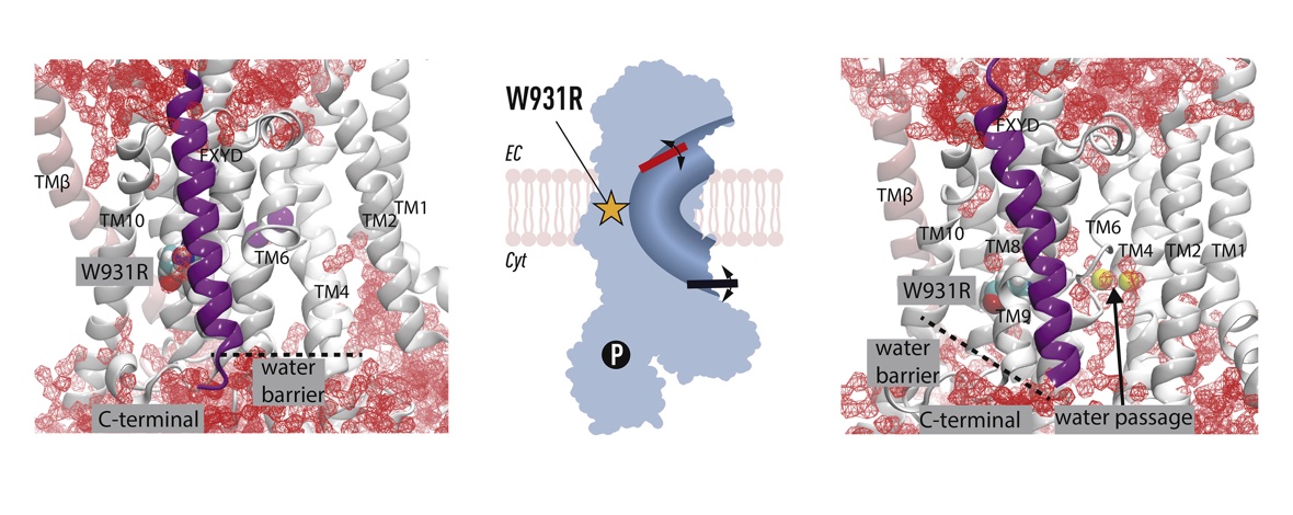The ion pump Na+,K+-ATPase is a critical determinant of neuronal excitability; however, its role in the etiology of diseases of the central nervous system (CNS) is largely unknown. We describe here the molecular phenotype of a Trp931Arg mutation of the Na+,K+-ATPase catalytic α1 subunit in an infant diagnosed with therapy-resistant lethal epilepsy. In addition to the pathological CNS phenotype, we also detected renal wasting of Mg2+. We found that membrane expression of the mutant α1 protein was low, and ion pumping activity was lost. Arginine insertion into membrane proteins can generate water-filled pores in the plasma membrane, and our molecular dynamic (MD) simulations of the principle states of Na+,K+-ATPase transport demonstrated massive water inflow into mutant α1 and destabilization of the ion-binding sites. MD simulations also indicated that a water pathway was created between the mutant arginine residue and the cytoplasm, and analysis of oocytes expressing mutant α1 detected a nonspecific cation current. Finally, neurons expressing mutant α1 were observed to be depolarized compared with neurons expressing wild-type protein, compatible with a lowered threshold for epileptic seizures. The results imply that Na+,K+-ATPase should be considered a neuronal locus minoris resistentia in diseases associated with epilepsy and with loss of plasma membrane integrity.